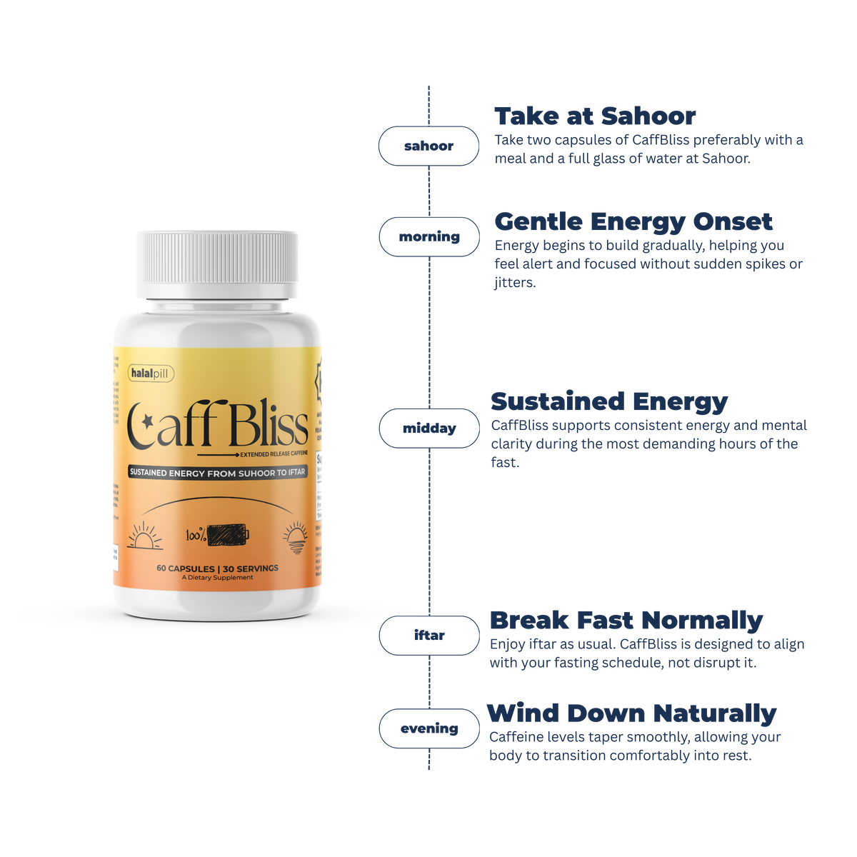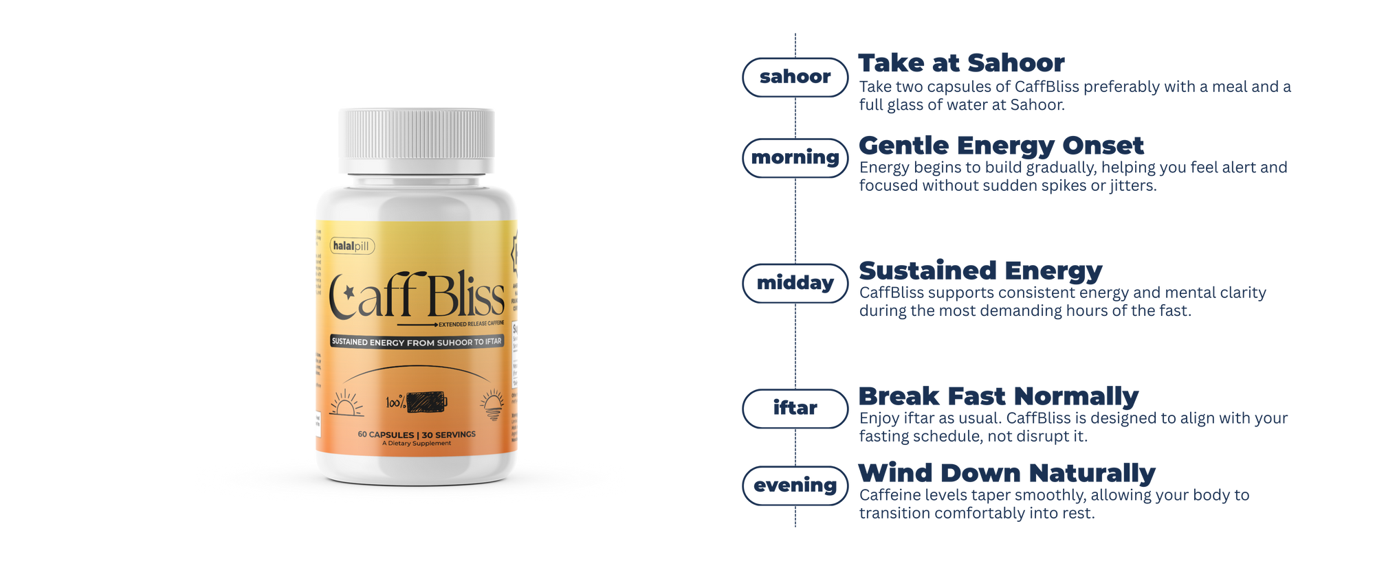 An extended release caffeine pill that was specifically made for the Muslim community managing a busy routine in the fast-paced environment of western countries.